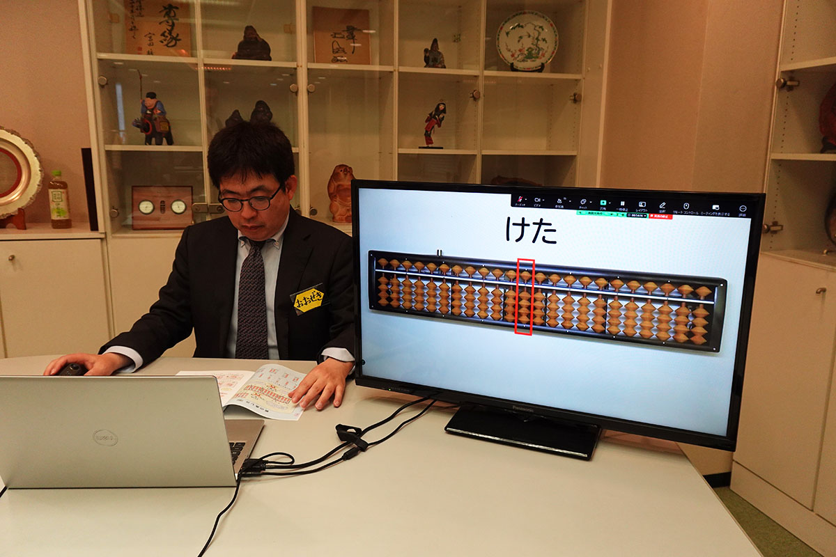 zoom接続で、映像を一緒に見ることで、複数の小学校が、同時に「そろばん授業」に参加できました。